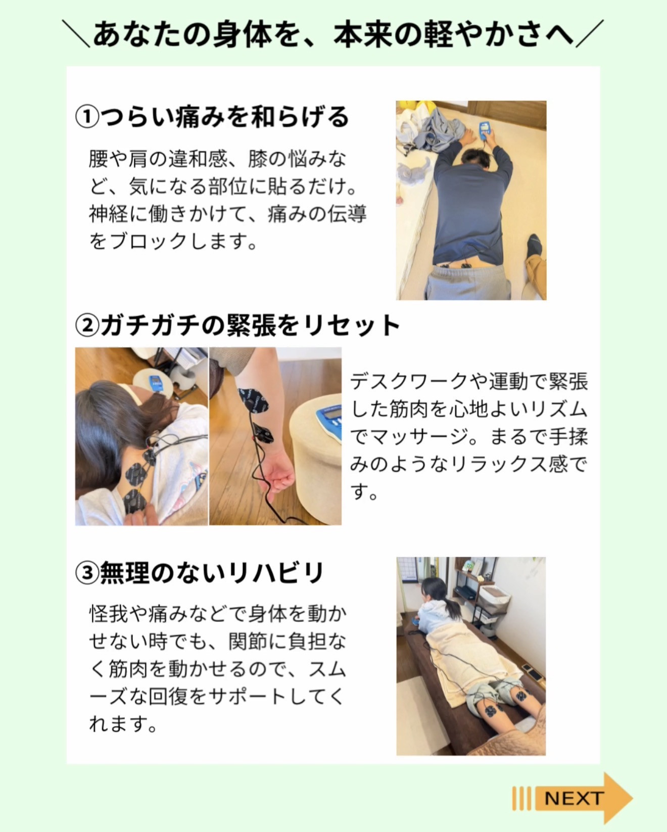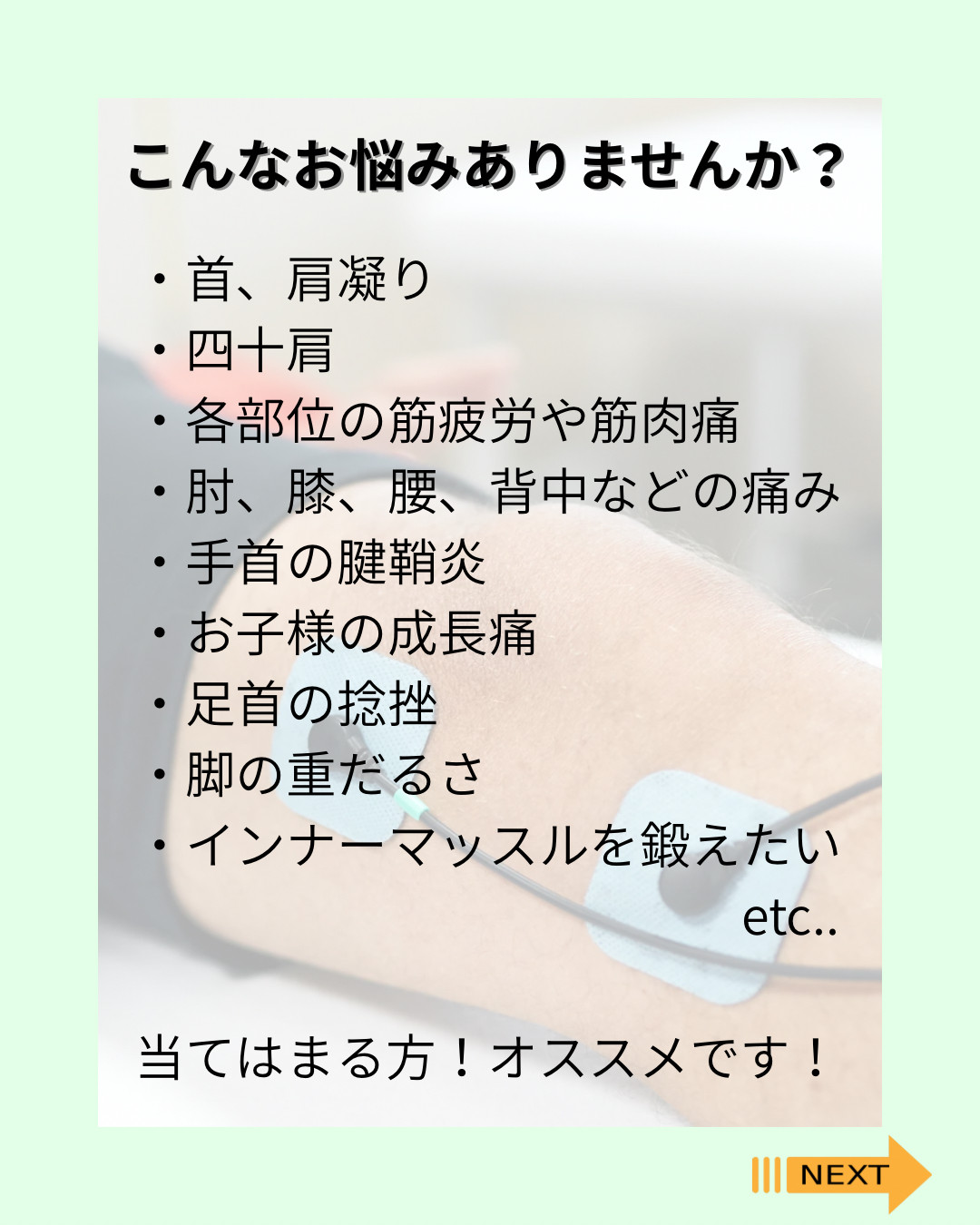凝りや筋肉痛はもちろん、スポーツ障害や四十肩、腰痛などの